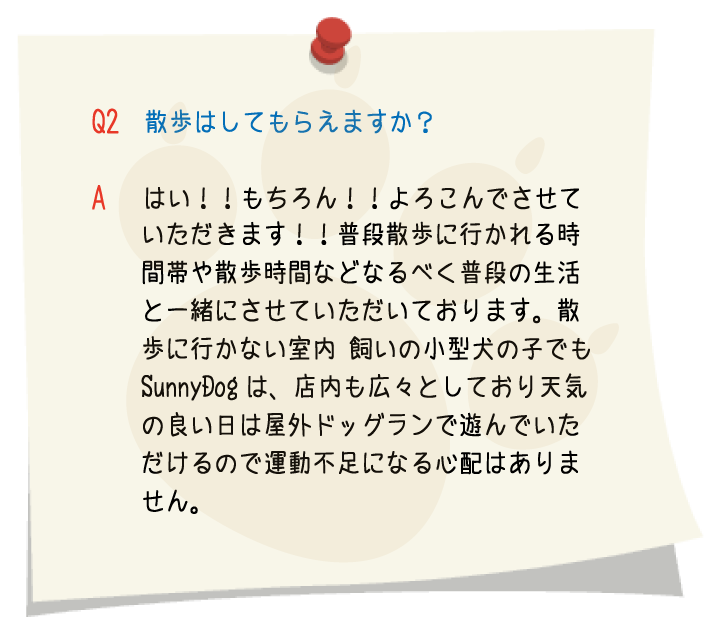 様々な性格のワンちゃん・オーナー様のご要望に出来る限り対応させていただくためSunny Dog(サニードッグ)では、
