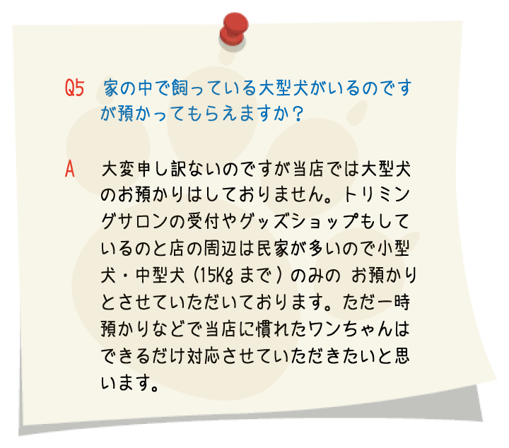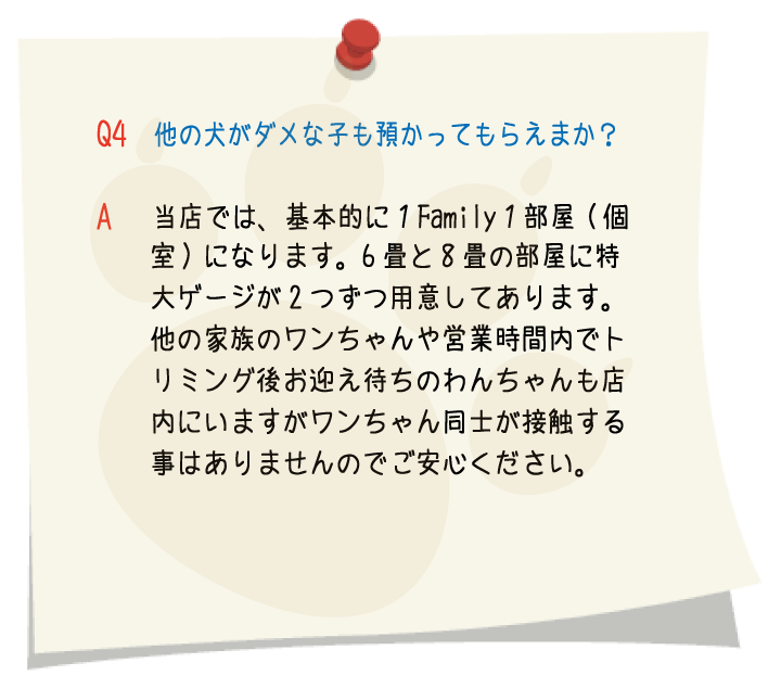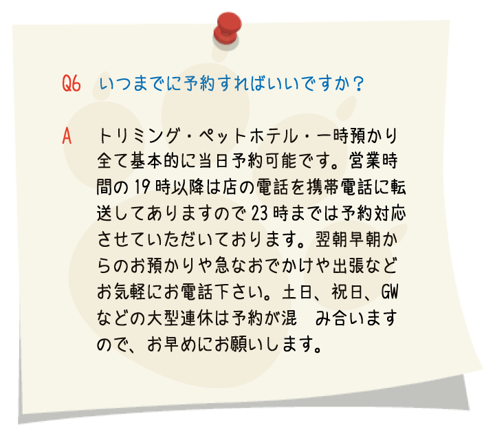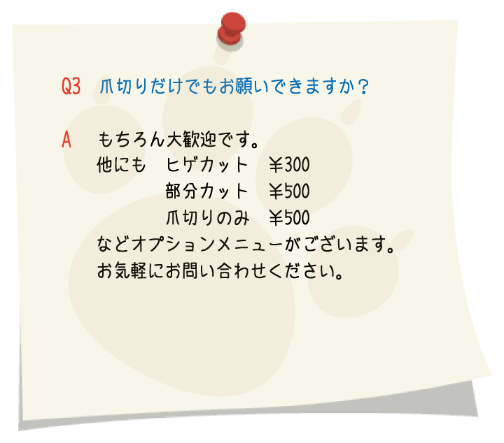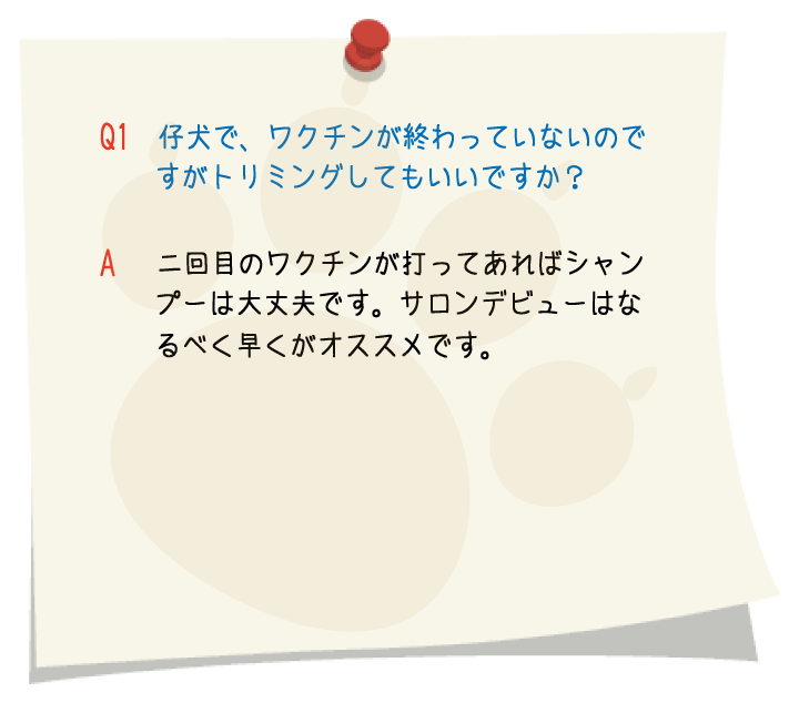 トリミングの予約に余裕を持たせてありますので、トリミングに慣れていないワンちゃんや、怖がりのワンちゃんにも